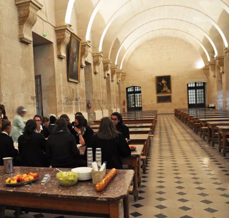 Now, back to research, which, in the end, drove the flow of dialog in Chapter 5. The scene starts in the Saint Denis refectory (cafeteria). Another admission: I knew what refectory meant, but I had never spoken that word out loud before writing this chapter. Since the St. Denis school was once an abbey, maybe the term is associated with religious buildings.